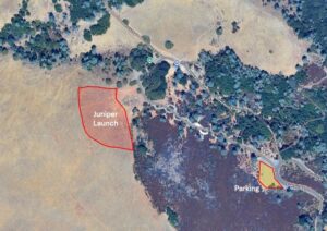 “Juniper Launch” is a large, grassy, gently sloping ridge facing West-Southwest. The launch altitude is approximately 2850ft MSL. This site should only be used in West to Southwest wind conditions, or in very weak Northeast conditions when local lee-side thermals are strong enough to completely block the prevailing wind. The “1000 foot” landing area is straight out from launch. There are camping facilities adjacent to this launch site. Pilots may unload their gear from vehicles adjacent to the launch area, but should park in the large parking lot at the entrance to Juniper Campground away from the campsites. Pilots must not park in the campground, since parking spaces are reserved for campers with reservations.