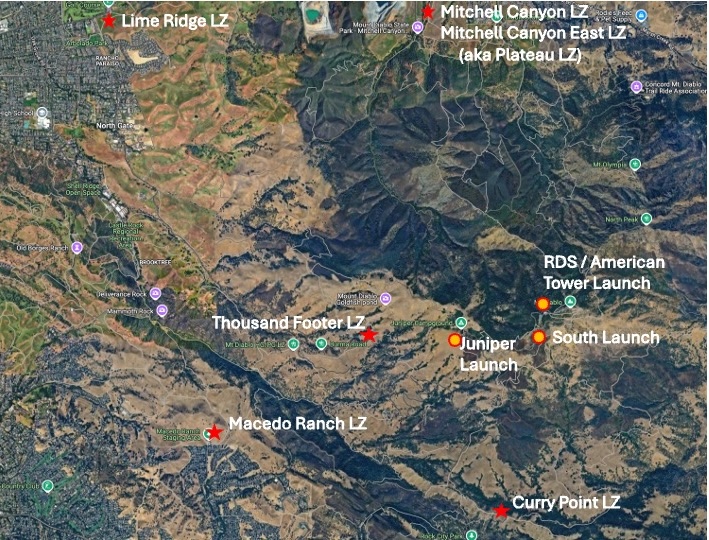 Within and near the park, Mt. Diablo has a number of good LZs (listed below). Many open areas to the southwest allow safe landings when flying xc.