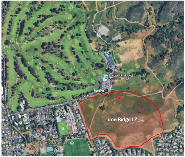 Lime Ridge is just south of the Boundary Oak Golf Course, at the end of Valley Vista Rd. This landing area is outside the responsibility of the State Parks. WOR has a special agreement with the City of Walnut Creek. State Parks assumes no liability for the use or misuse of this site. This landing zone is an alternative to the Thousand-Footer when south-to-west winds are stronger, making the Thousand-Footer a difficult landing site. This hillside LZ has no significant obstacles, and is well removed from the access path. Public parking spots are on Valley Vista Rd.