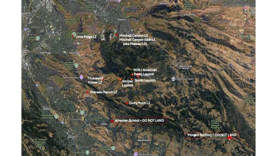 Mt. Diablo has several landing zones – five within the park, and one just outside. There are other possible safe landing options outside of the park boundaries.